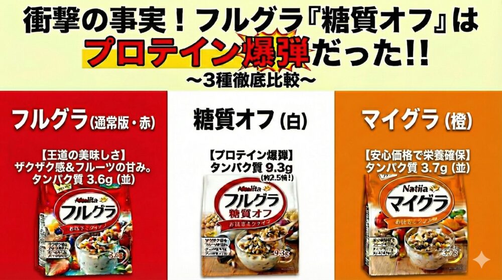 | 項目 | フルグラ(赤) | 糖質オフ(白) | マイグラ(橙) |