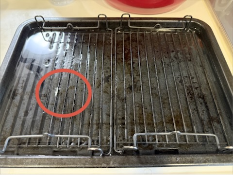 角皿にクッキングシート(またはアルミホイル)を敷いてから網を乗せて魚を焼けば、魚の脂はすべてシートの上に落ちる。つまり、角皿を洗う手間すら省けるのだ。