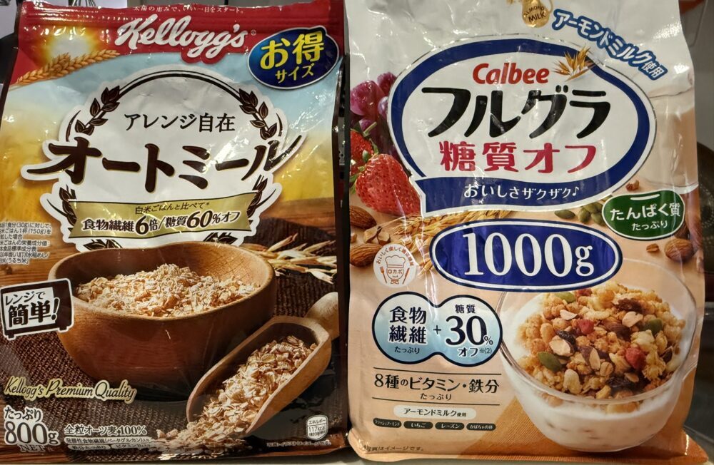 比較対象は、私が愛用していた最安のオートミール(ケロッグ:1食分30g)と、「フルグラ糖質オフ」(カルビー:1食分50g)。