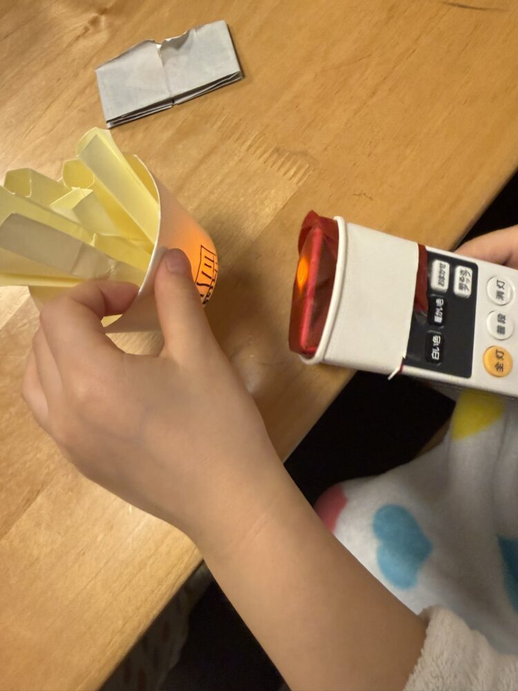 ・リモコンの上部に赤いセロファンを巻き、レーザー光っぽく見立てる。