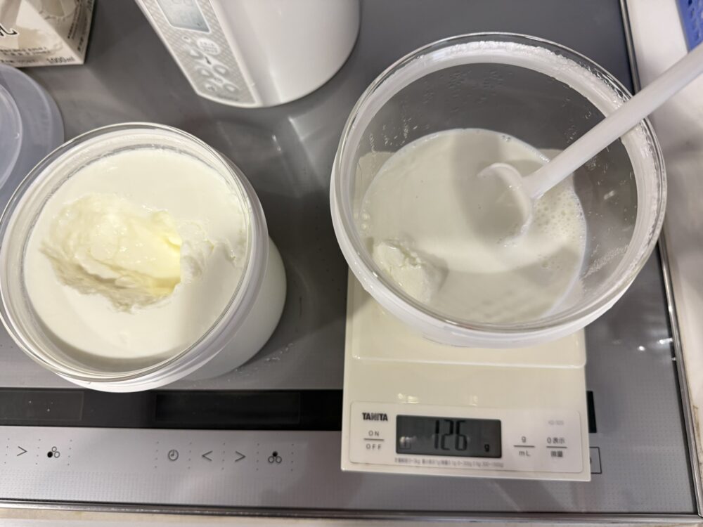 注意!ここで牛乳1Lを一気に入れてはいけない。(種ヨーグルトが均一にまざらなくなるため)- 仕上げ: 残りの牛乳を入れ、さらに混ぜる