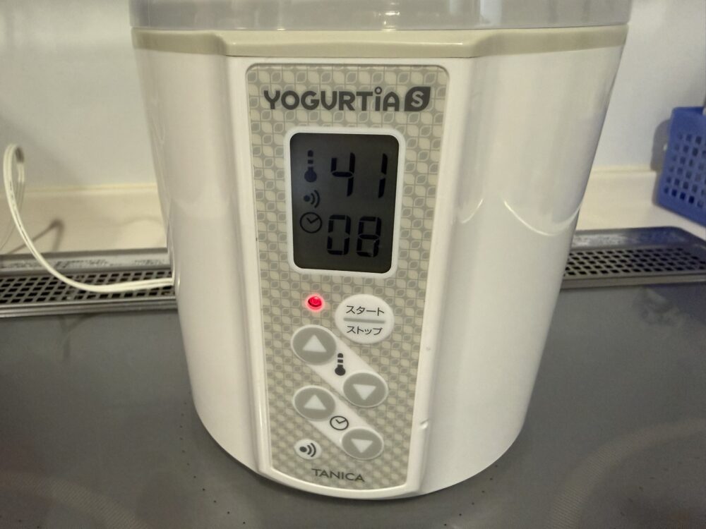 - 投入: 1Lの牛乳を1/4入れ、種ヨーグルトを入れて混ぜる